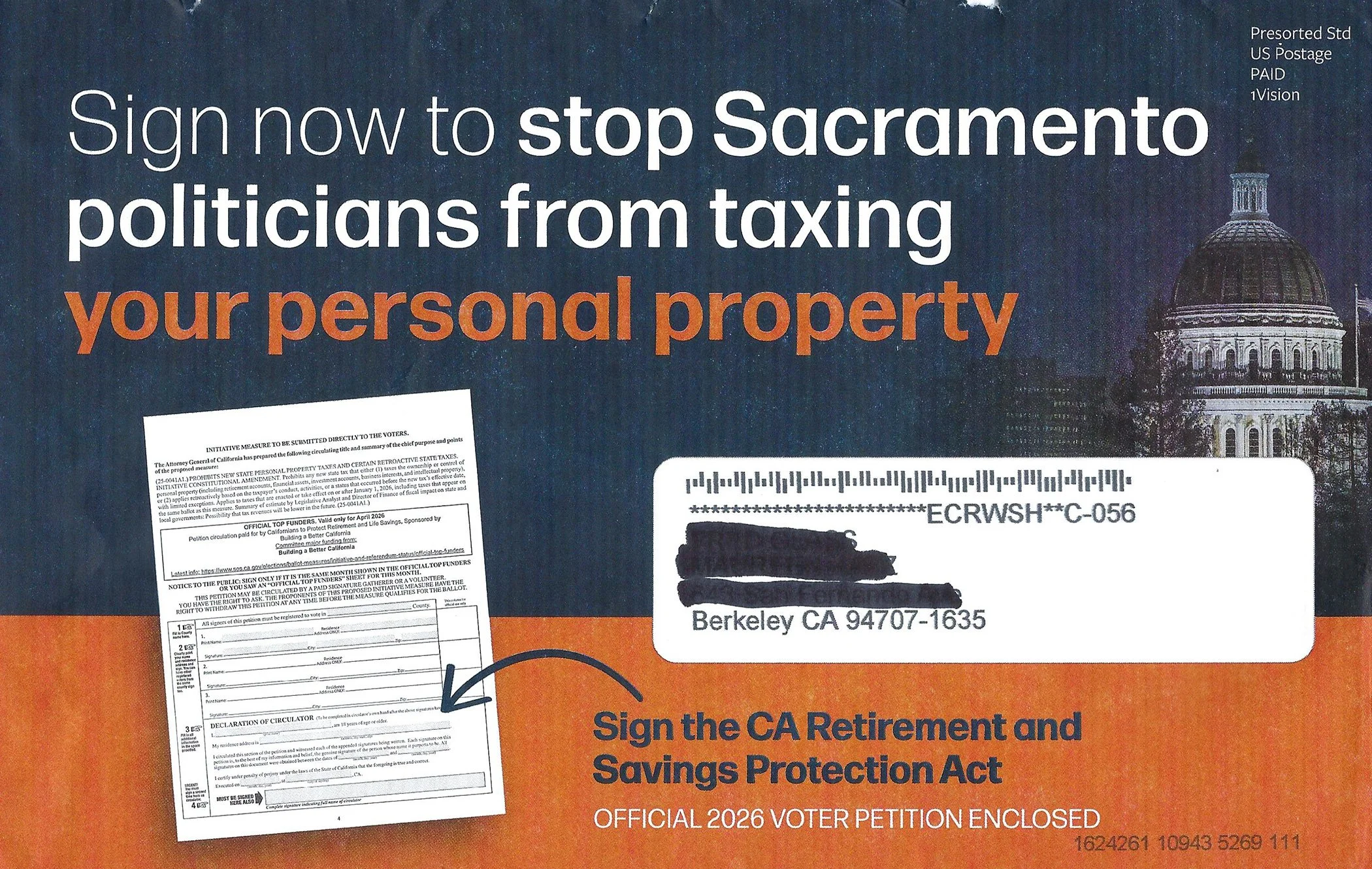 The outside of the mailer said, “Sign now to stop Sacramento politicians from taxing your personal property”. On the inside, the unnamed politicians pushing their unnamed tax on everyone were further chastised.