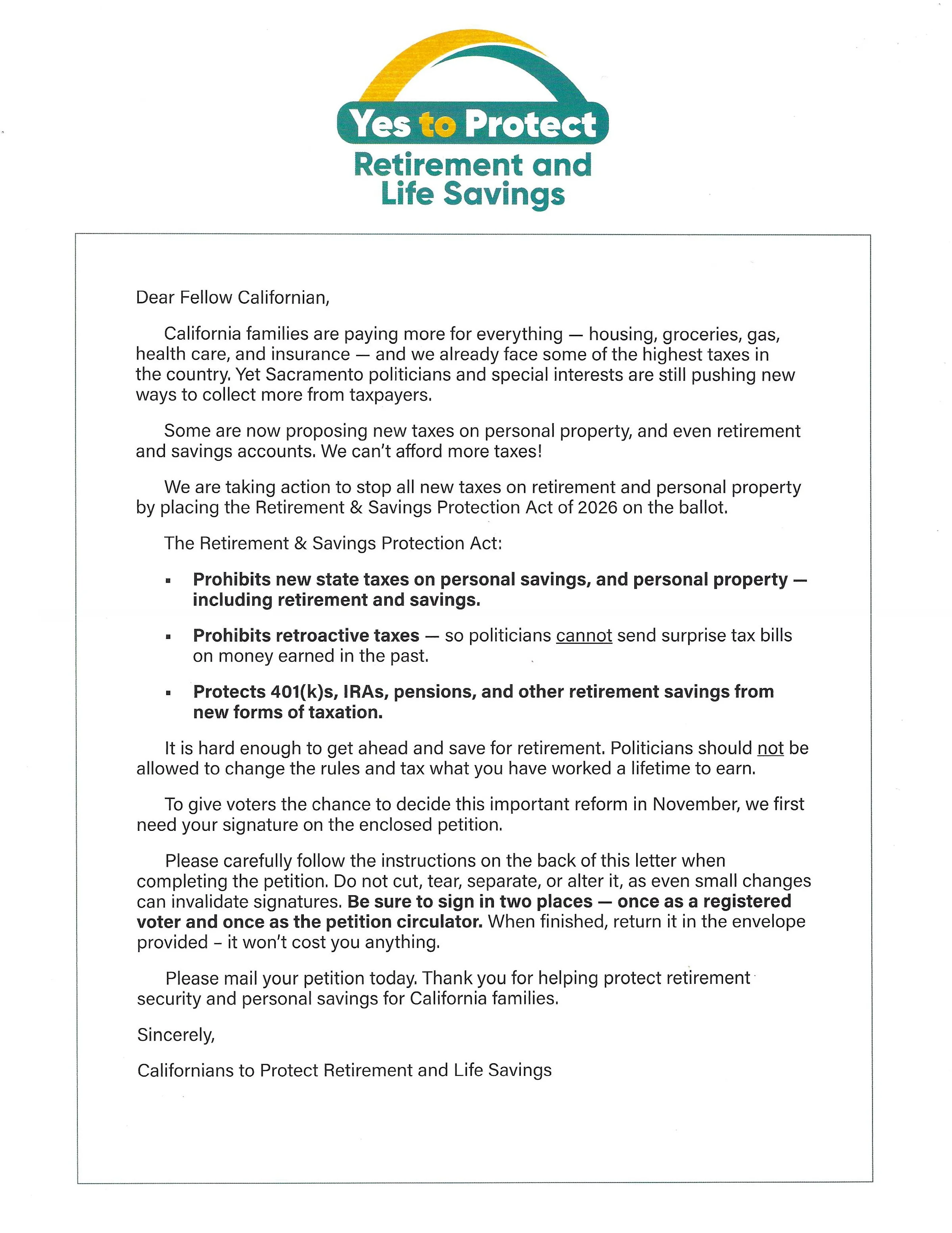 Designed to mimic official state electoral mailers—the printing even said “OFFICIAL 2026 VOTER PETITION ENCLOSED”—it contained three elements: a flyer headed “Yes to Protect Retirement and Life Savings”; a petition for an initiative measure for the November state ballot; and an already-paid return envelope to send the filled-in petition to something called “Californians To Protect Retirement and Life Savings” at a Burbank P.O. Box.