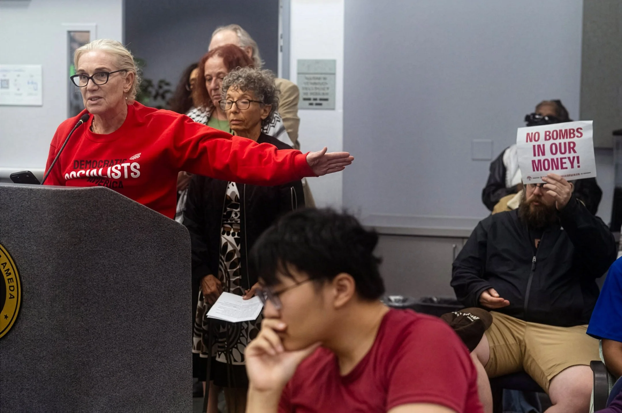 “I’m super excited that we managed to adopt the Ethical Investment Policy,” said Hannah Gramling, who came to the special meeting to show her support for the EIP, along with hundreds of other Alameda residents, many of whom wore keffiyehs and held homemade signs. “We’re a little disappointed that there’s yet another procedural hoop to jump through [before the policy is implemented], but I think this is a huge win for us and for the 18 months of organizing that we’ve done.”