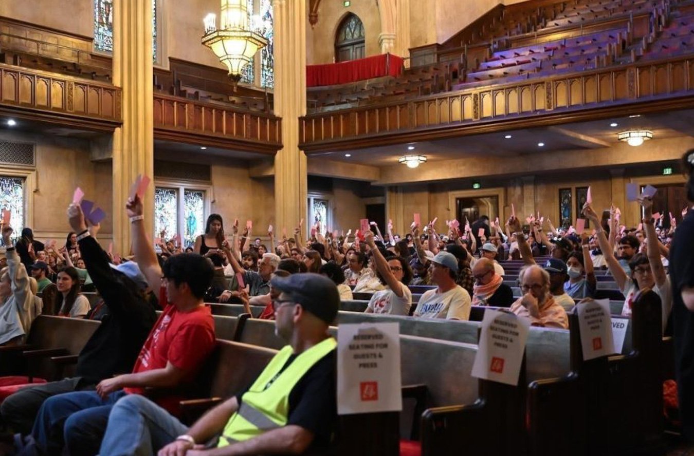 On a late March afternoon, beneath the vaulted, medieval-revival ceiling of Immanuel Presbyterian Church, more than four hundred members of the Los Angeles chapter of the Democratic Socialists of America (DSA) gathered in the lingering heat of a citywide heat wave. The air inside the sanctuary was thick and stubborn as members fanned themselves with paper copies of the meeting agenda and shifted in their seats.