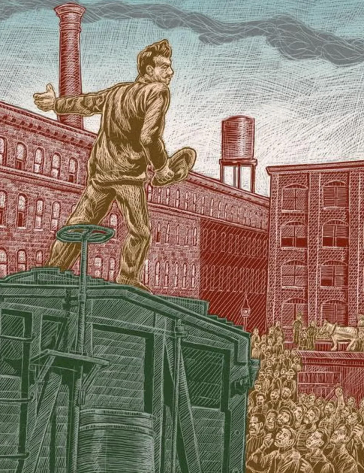 August Spies addresses crowd of workers outside the McCormick factory, Chicago, May 3, 1886, by Jos Sances, illustration for We Mean to Make Things Over: A History of May Day