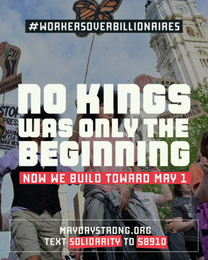 This mass demonstration of opposition is absolutely necessary, but not sufficient to stop MAGA from dragging us along on its road to hell. For that we need to be broadening the struggle with other tactics and strategies (mutual aid, mass strikes, non-violent direct action, and electoral politics) that build a powerful anti-fascist movement and lay the basis for moving past the failed politics of the past. What happened in Minneapolis/St. Paul on January 23—‘No Work, No School, No Shopping’—is the best example so far. DSA has joined with labor and community partners in the May Day Strong coalition, which understands “No Kings” as a step toward a sharper critique of capitalism on May 1. On that day we will see how prepared we are to advance beyond a nationwide demonstration to a national movement.