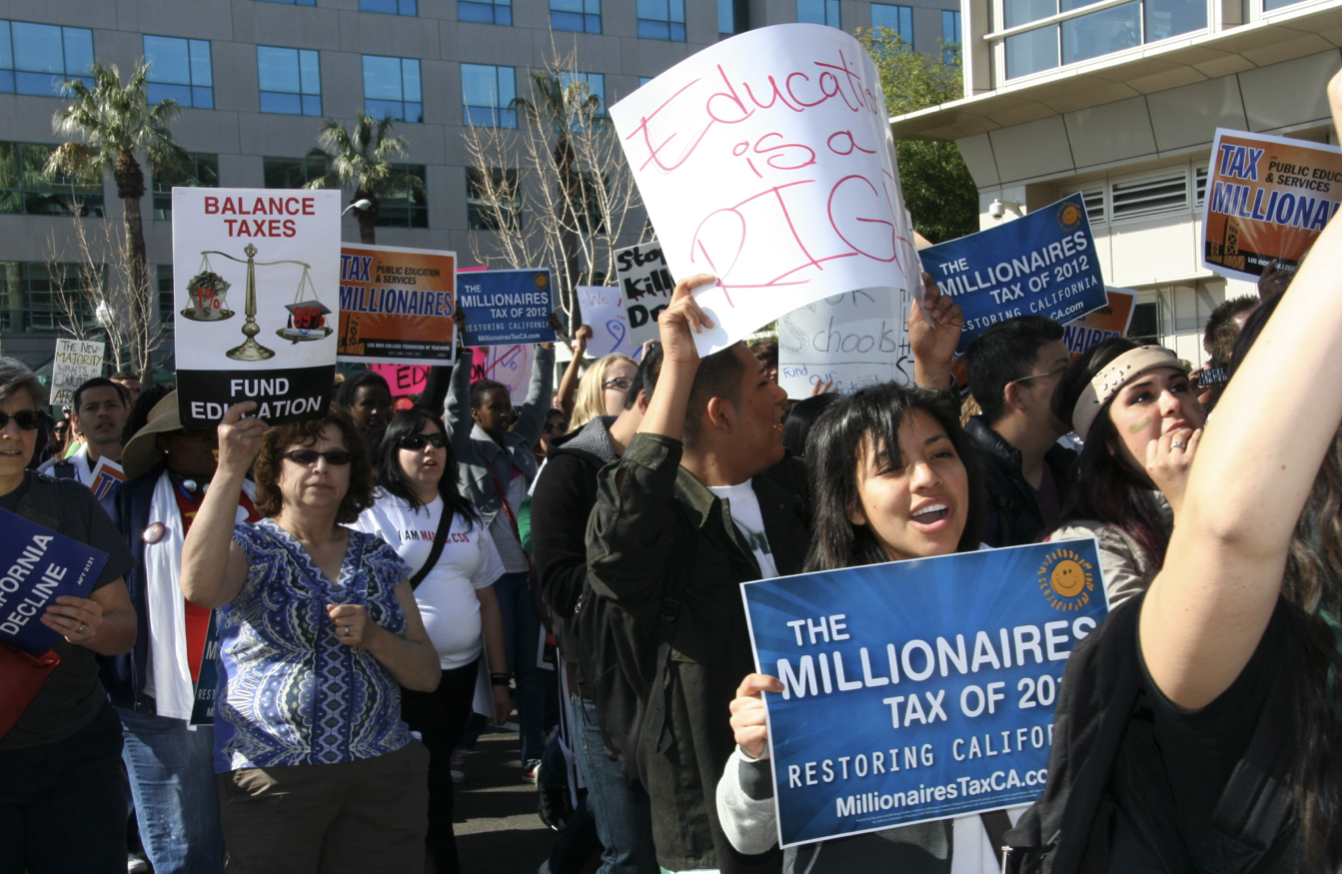 The Millionaires Tax campaign of 2011-2012 was a rowdy grassroots movement that forced Governor Brown to merge his ballot measure with theirs to create Proposition 30.
