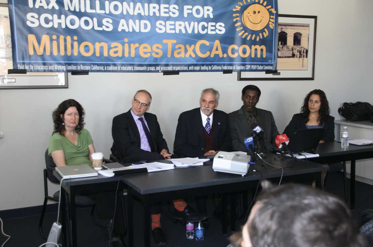 Millionaires Tax campaign leaders, 2012: (from left to right) Amy Schur of ACCE; Rick Jacobs, Courage Campaign; Joshua Pechthalt, CFT; Anthony Thigpenn, California Calls; and pollster.