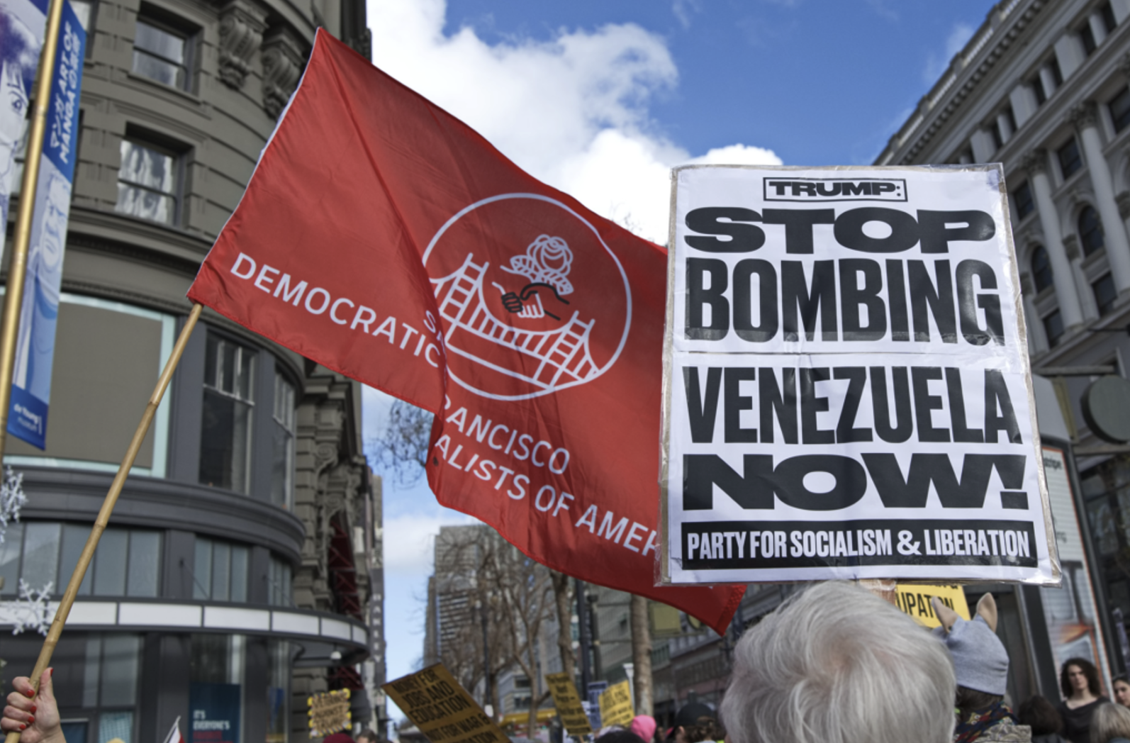 California DSA chapters have been quick to respond to the attack on Venezuela and kidnapping of President Nicolás Maduro and First Lady Cilia Flores. DSA issued a call for chapters across the country to stage demonstrations on January 10 “to protest th[e] illegal war and stand in solidarity with the sovereign people of Venezuela.” DSA raised demands including freedom for President Maduro and First Lady Flores, passage of the War Powers Resolution, impeachment of Trump for war crimes, no war for oil, and an end to all sanctions against Venezuela. San Francisco and East Bay DSA joined with the Party for Socialism and Liberation to co-lead a rally and march in San Francisco. Silicon Valley DSA rallied with a coalition of partners and Los Angeles DSA also hit the streets.